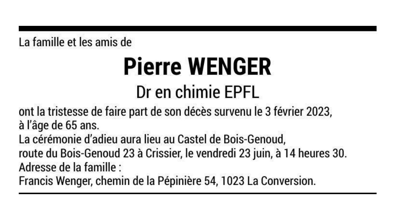 Pierre WENGER Dr en chimie EPFL 03 fév. 2023 Avis mortuaire PFG Télecharger PDF Partager sur: Galerie PreviousNext PreviousNext